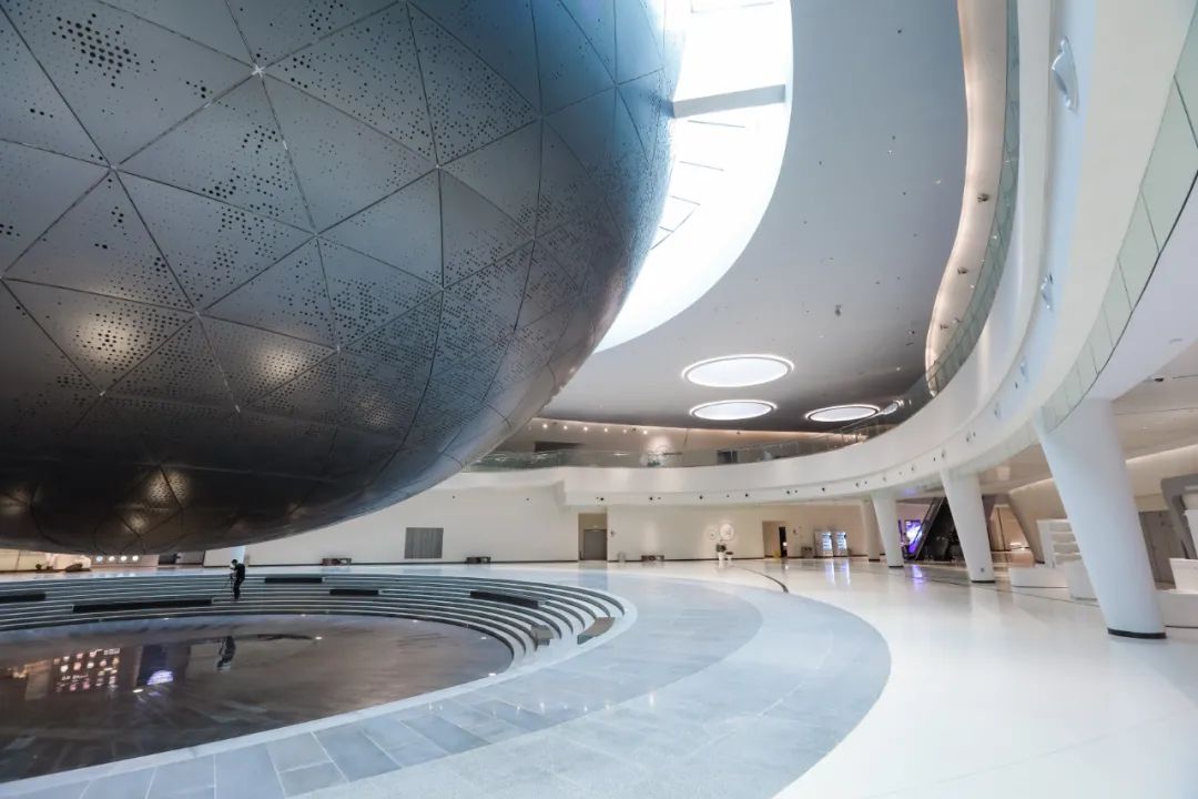 外径30米、内径23米的球幕影院,它的外形正是主建筑的“三体”之一,令人叹为观止的“漂浮星球”。其内部则是一套全球最先进的8K分辨率球幕投影系统,配以高级激光表演系统和舞台表演系统,带给观众各种震撼心灵的宇宙大片体验,还有梦幻般的“星空音乐会”等。