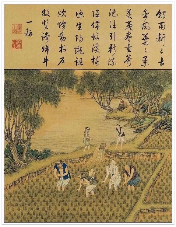 伏天的农活可归结为”一耥二耘三拔稗” 。”一耥” ,是耥稻,农人推着耥耙在水稻株行之间,疏松表面泥土,促进秧苗长根,同时也不给杂草留下过多的生长空间。耥耙,是传统的耥田工具,苏南地区俗称”乌头”,有竹柄,柄下有船形木板,板底钉着交错铁齿,农人握着竹柄可在水田里前推、后拉。俗谚有”小娘要郎,小秧要耥” ,这”一耥”的重要性不言而喻。