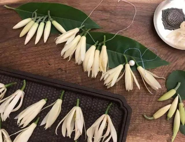 比起茉莉花、栀子花,白兰花的名气比较小,然而它才是卖花阿婆篮子里的主角。阿婆会用细线将白兰花单朵或者并蒂穿起来,买花人便将此挂在衣襟前的纽扣上,或是家中蚊帐的挂钩上,以使得枕席生香,氤氯伴梦。白兰花,是江南人对”白兰”的俗称,云南人叫它为缅桂花,四川人叫它为黄桷兰。栀子花浓烈洒脱,茉莉花羞涩纯然,白兰花则有一种古典之美,花瓣修长,玉质玲珑。”三白”中,它的花期最长。在流行穿旗袍的年代,穿旗袍、佩戴白兰花,被视为江南女子最为雅致的装扮。含蓄一点的女子,则会用手绢包好花朵,藏于衣襟口袋之中,是谓”闻香不见花”。