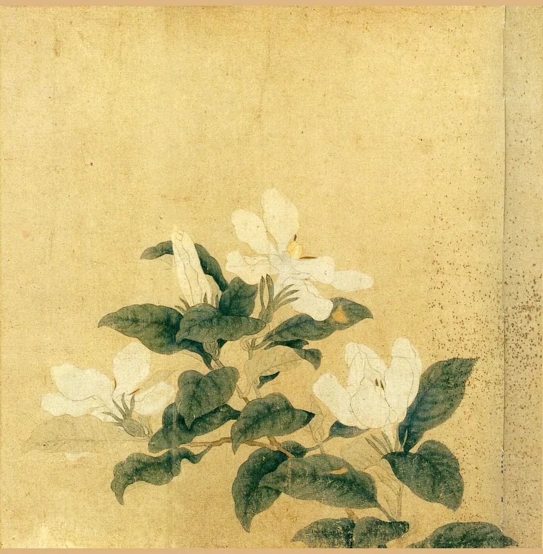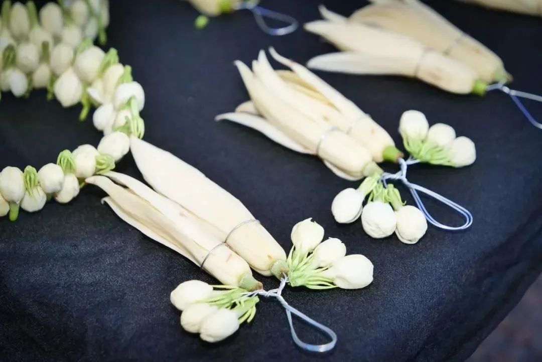 三种花中,栀子花是最典型的南方花朵六瓣平铺,花色洁白,肥润水灵。栀子花香气馥郁,在蒙蒙的雨中也十分浓郁。它总是伴随着江南的雨而绽放,从6月的黄梅雨季一直开到7月的阵阵雷雨。雨后,素白的花瓣上缀满水滴,如纤弱的女子蜷于绿叶之下。栀子飘香,无处不及,南宋诗人杨万里《栀子花》诗中曾赞它:“孤姿妍外净,幽酸暑中寒。有朵篸瓶子,无风忽鼻端。”栀子花不常佩戴于身,更多的是连枝买来,插于堂中瓶内,只需几枝,满室生香,自然消暑。