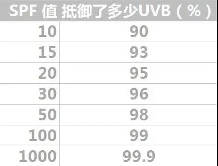 能穿过1/20的紫外线,也就是抵御了19/20的紫外线,因此SPF20的防晒霜可以抵御95%的紫外线。以此类推,SPF50的防晒霜可以抵御98%的紫外线。事实上,SPF50的防晒霜只比SPF20的防晒霜多抵御了3%的紫外线,差别并不大。