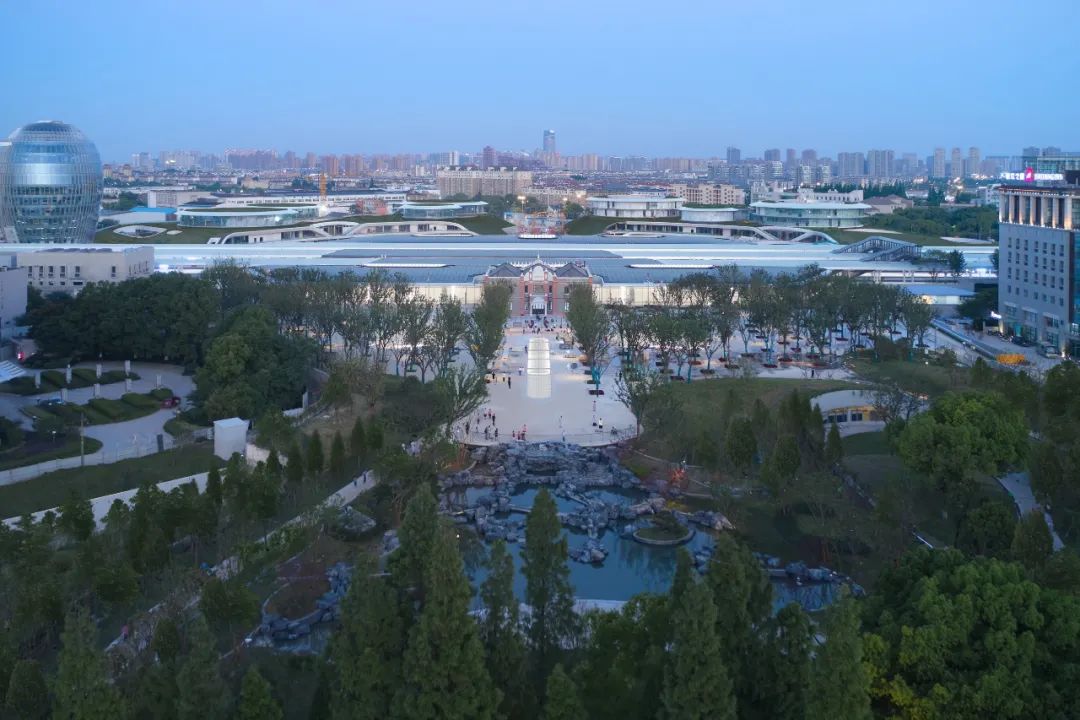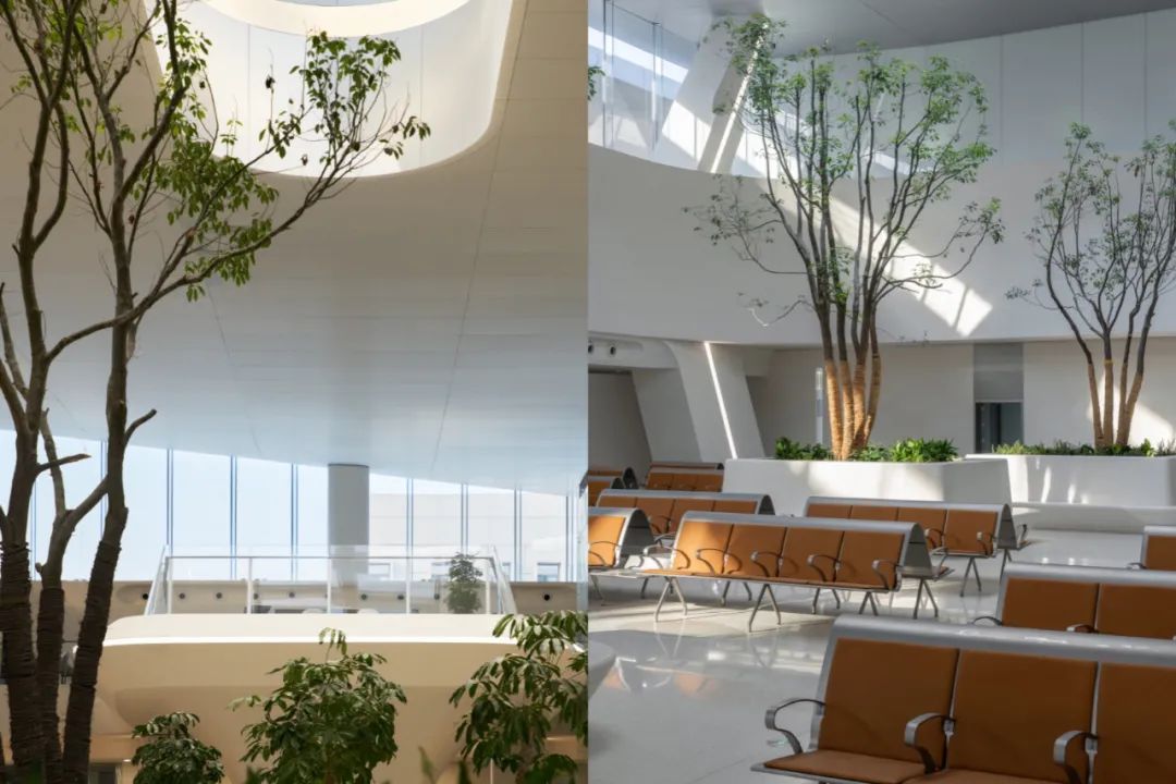 改造完成的嘉兴火车站栽种了包括榉木、香樟、桂花、枫树、乌桕、水杉、樱花等超过1500 棵树木。以老站房为主的精神轴线贯穿始终,两侧种满榉木。榉木完全成型后,树冠将相连覆盖整个站前北广场。仍在建造中的站前南广场,看上去像是连绵起伏的绿丘,七座拥有不同功能的建筑分散其中,像是漂浮在大地之上的翠环,极具未来感。