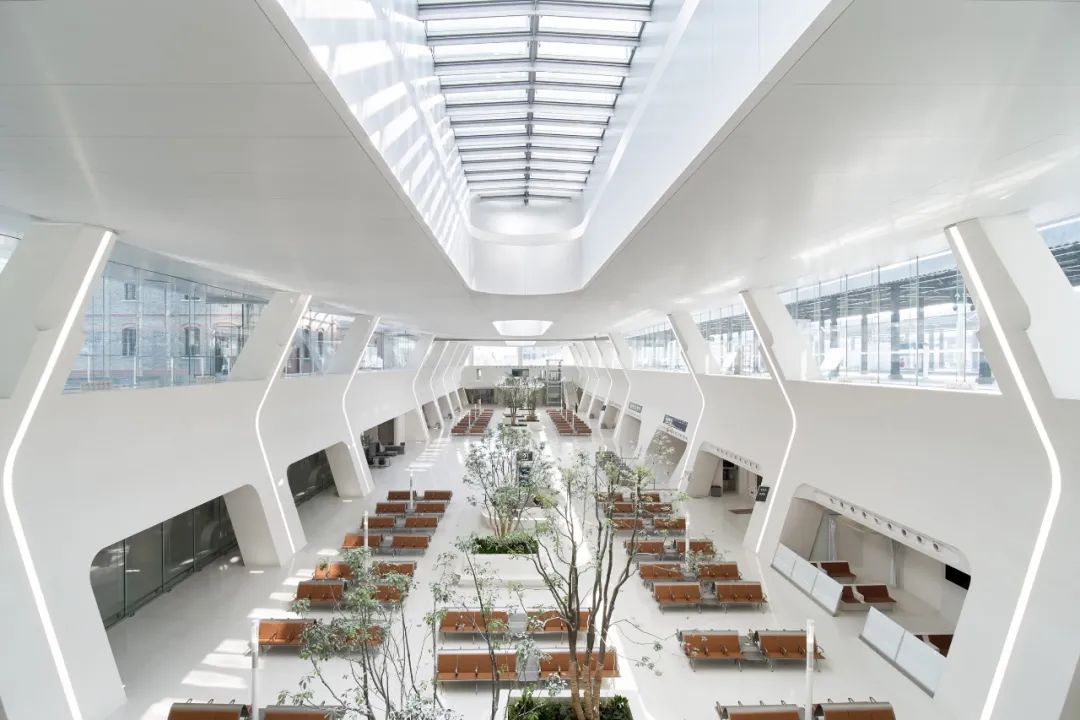 地下候车大厅内,充沛的自然光通过大量天窗和一层玻璃幕墙向内倾泻,让室内空间开阔明朗。旅客在候车厅内,抬头即可见地面的复建站房仍保留着百年前的历史风貌,新与旧在这里相遇,时空的张力不禁让人感动。火车站的建筑美学