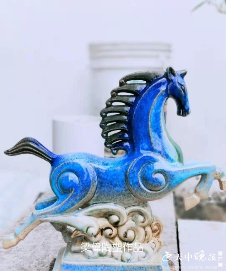 传统与时尚结合让土陶绽放异彩 在梁伟的工作室里,有着不少刚成型的陶胚,最显眼处是一组马的陶胚。“咱驻马店叫驿城,我又最喜欢马,所以就经常会制作各种马的陶器。”梁伟说。
