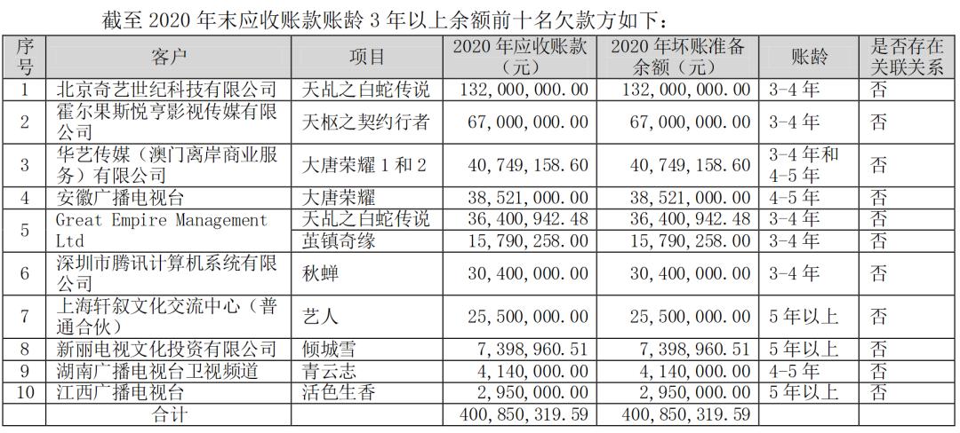 回复公告中,欢瑞披露了账龄3年以上的前十名欠款方,爱奇艺、腾讯视频、安徽广电、湖南广电等多家平台在列,累计欠款金额超4亿,涉及项目也覆盖到《天乩之白蛇传说》《大唐荣耀》《秋蝉》《青云志》等欢瑞的重点项目。