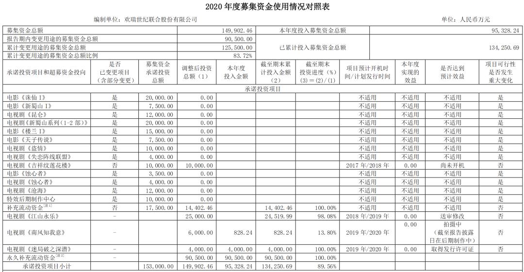 巧合的是,欢瑞世纪在2017年,曾公开募资13.55亿元,其中12.55亿元用于投资电视剧/电影项目、1亿元用于建设后期制作中心。然而,相关募集资金并没有真正用于相关项目的发展。