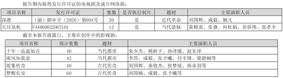 另一方面,与同类上市公司相比,欢瑞目前的内容储备也不算多。财报内容显示,截至2020年底,公司处在发行和创作期的主要项目仅6部。