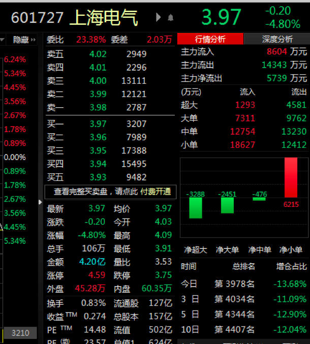 7月5日晚间,上海电气公告称,因公司涉嫌信息披露违法违规,证监会决定对公司立案调查。受以上消息影响,7月6日,上海电气股价盘中一度跌幅超5.6%,收盘最终报3.97元,跌幅4.8%,当前总市值623.5亿元。H股跌0.99%,报2.00港元/股,总市值314亿港元。