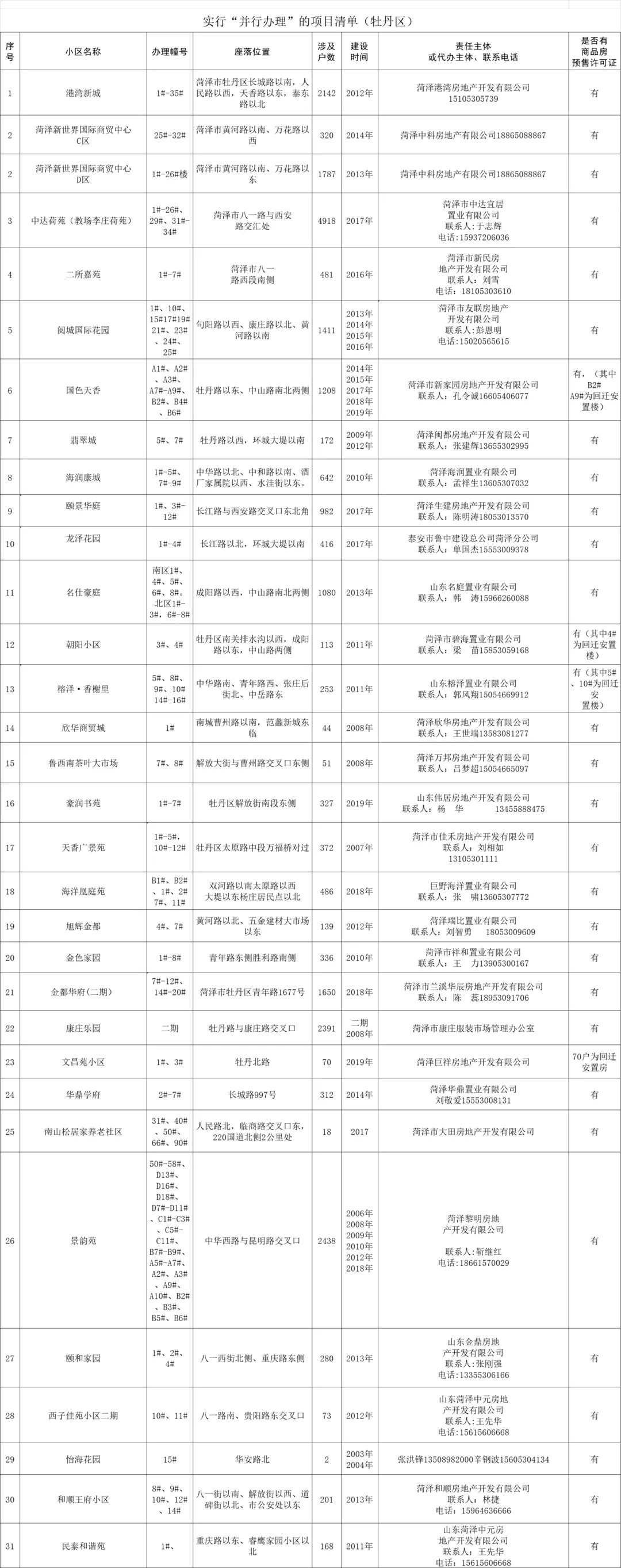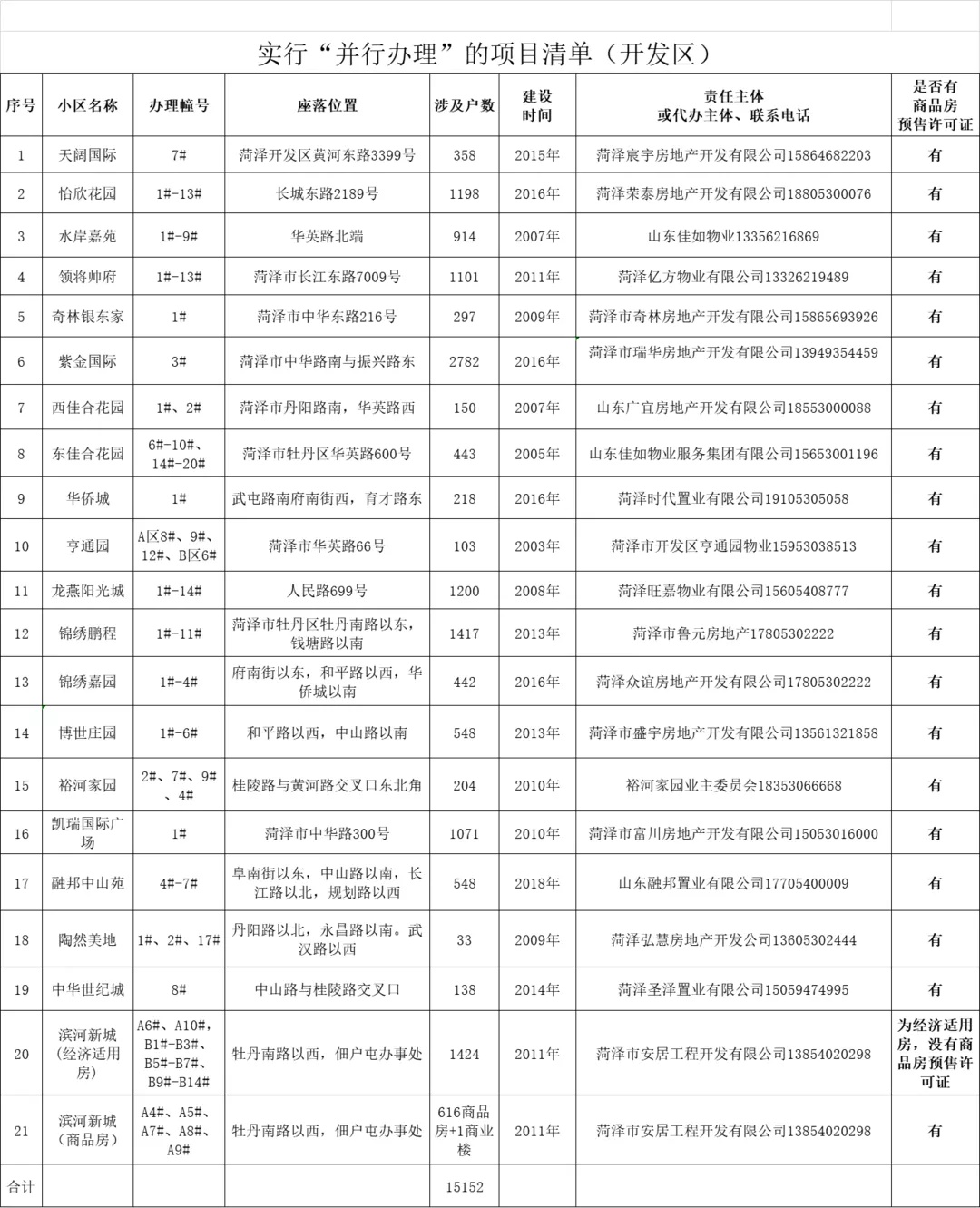 根据菏泽市人民政府《化解市区居民住房产权历史遗留问题专题会议纪要》(第14期,菏泽市人民政府办公室2021年7月1日印发),对牡丹区38个小区、27645户,开发区21个小区、15152户,共计59个小区、42797户历史遗留问题项目采用“办理不动产登记与建设单位追溯法律责任完善手续并行办理”的方式进行化解。