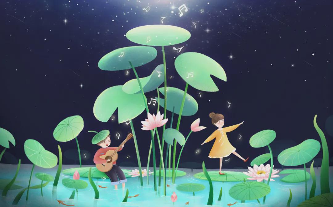 月明之夜,船家儿女吹着短笛,笛声参差而起,在水面萦绕不绝。晚风初定,池中莲花盛开,自在幽香不时散溢,沁人心脾。