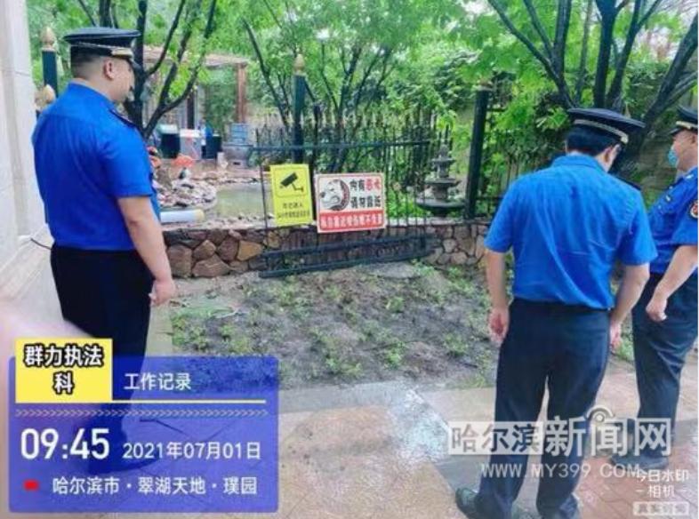 道里区执法局相关工作人员介绍,他们在30日组织执法人员多次到达现场踏查。经核查,该处花园原为小区公共绿地,依据《中华人民共和国城乡规划法》相关规定,该处花园属于未取得建设工程规划许可证所搭建的铁制构筑物,属于违建。