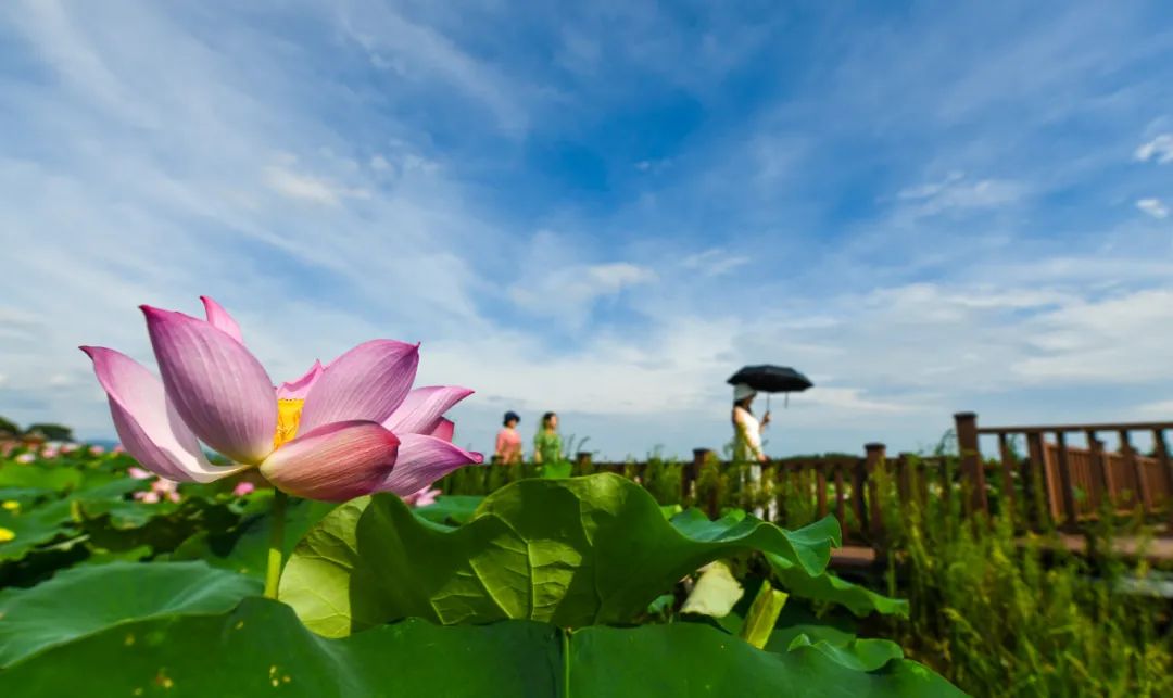 7月3日,在湖南常宁市胜桥镇苍坪村,游客在赏荷游玩。新华社发(周秀鱼春摄)