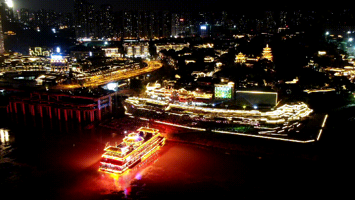 入夜,投资2000万元全新打造的磁器口特色夜景灯饰陆续点亮,沙磁艺术之窗水幕投影、磁器口嘉古院墙体3D投影、磁器口码头广场幻彩灯光秀等美轮美奂,展现“千年古镇”的新气象,创造不一样的古镇“夜游”体验。
