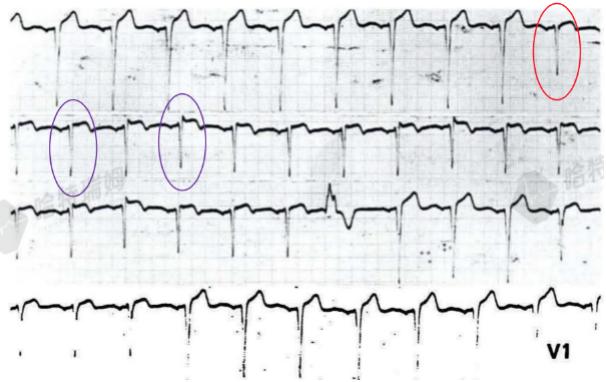 图3为一位46岁中年男性V1导联连续记录的心电图,可见红圈内的S波变浅,图中不同QRS波的r'的振幅不同,与RR间期有关(RR间期越短,心室率越快,r'越明显)。