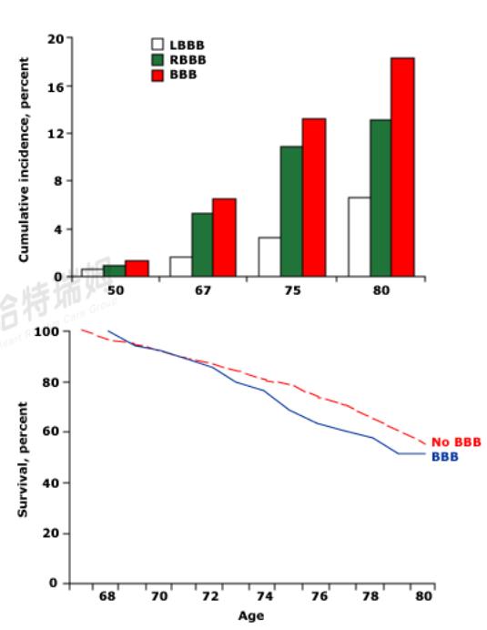 从临床医学的视角来看,右束支阻滞的患病率随着年龄增加而升高。一项前瞻性研究,对855名男性随访30年发现,50岁时的患病率为 0.8%,80岁时为11.3%。