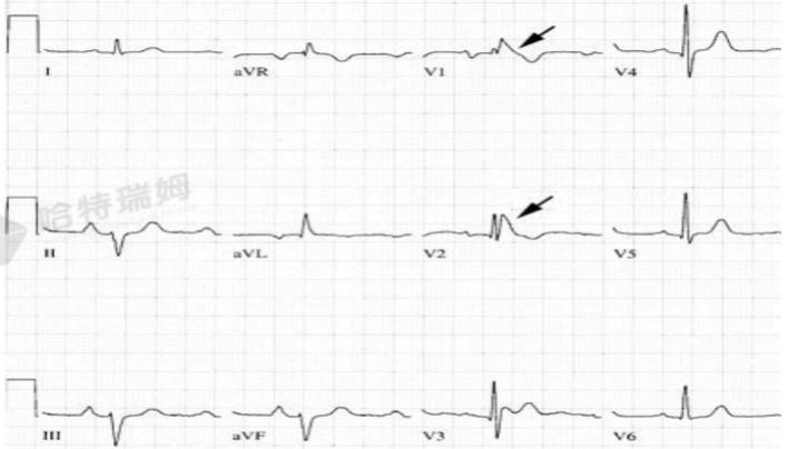 V1或V2导联出现rsr'、rsR'或rSR'波,R' 或r'波通常比初始R波更宽,少数患者的V1和/或V2导联可见宽R波,常有切迹;