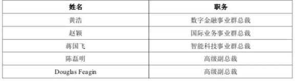 包括董事长兼首席执行官井贤栋、首席人才官曾松柏、首席技术官倪行军、首席财务官韩歆毅、首席法务官周志峰、首席合规官李臣、首席市场官陈亮、数字金融事业群总裁黄浩、国际事业群总裁赵颖、智能科技事业群总裁蒋国飞、社会公益与绿色发展事业群总裁彭翼捷、主管战略投资部的副总裁纪纲、主管战略发展部的副总裁尹铭、主管大安全事业群的副总裁赵闻飙,以及客户权益保障部总经理丁翌。