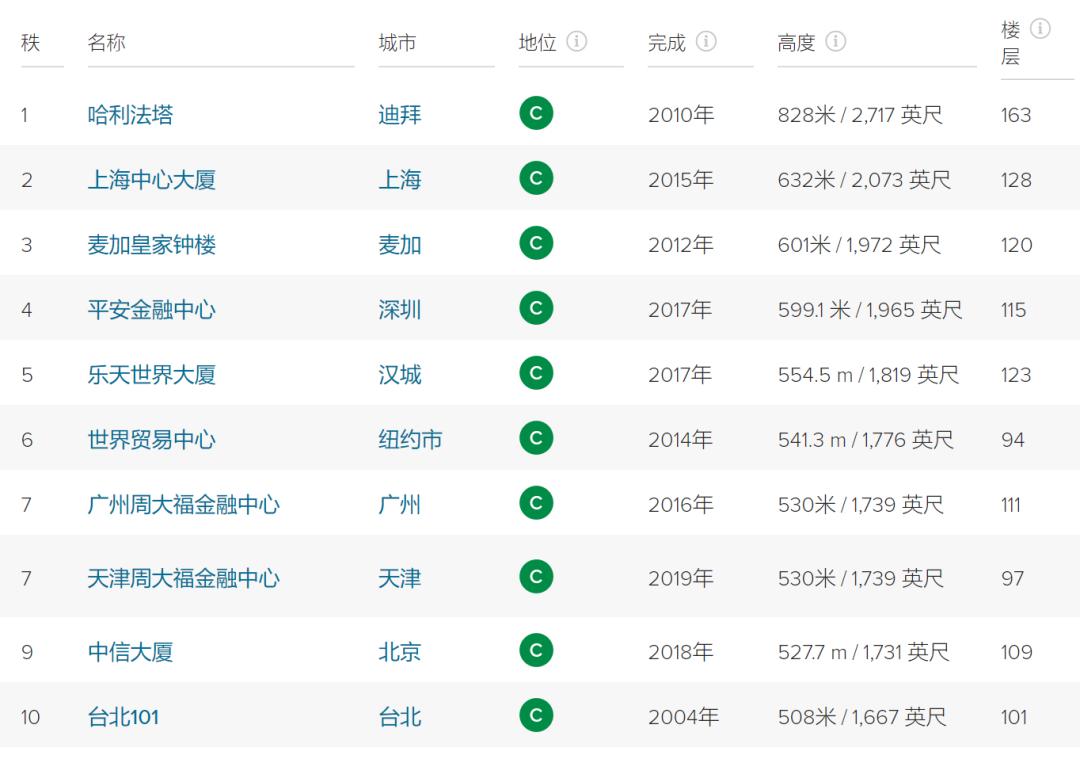 上海中心大厦、深圳平安金融中心、广州东塔(周大福金融中心)、天津周大福金融中心、北京中国尊(中信大厦)、台北101大厦。