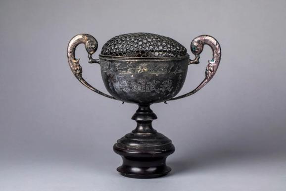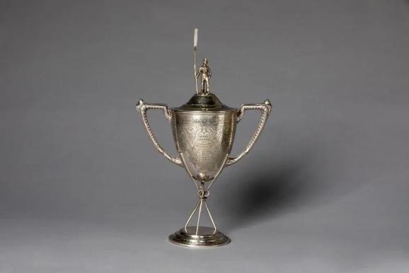 1878年上海赛艇比赛冠军奖杯,奖杯高36cm,由杯盖和杯体两部分组成。杯盖上方是一个手持赛艇划桨站立的外籍绅士造型。杯身和双耳雕刻有精美的装饰花纹,杯身铭文共计172字符,译为:1878年上海春季赛艇比赛,8人赛艇,红队夺冠,并刻有8位队员和划桨指挥以及舵手的名字。奖杯的底座由3支捆绑在一起的叉型划桨组成,整只奖杯设计主题鲜明,造型独特。本品为百年来近代中国体育的珍贵藏品,其造型别致,主题鲜明,铭文详细,为罕见的近代中国体育文物。
