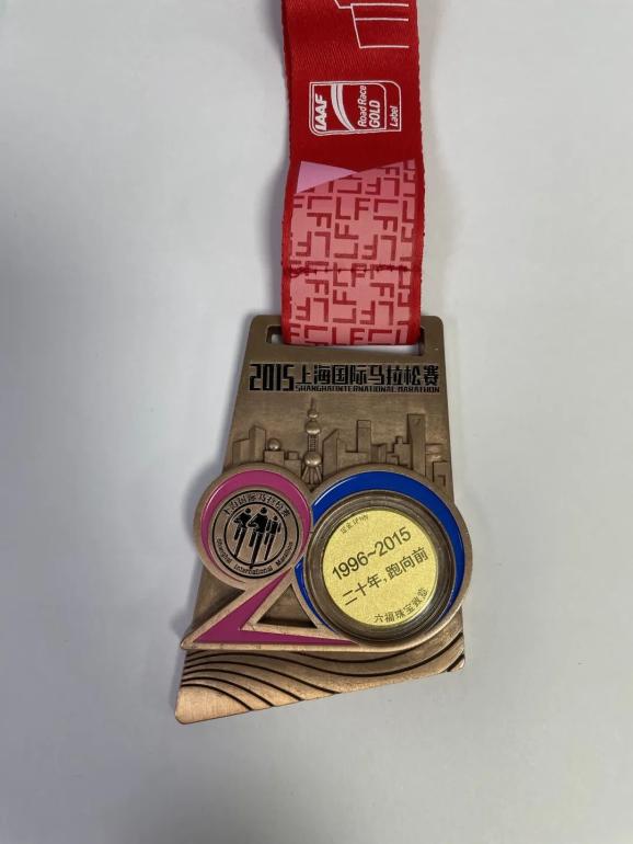 2015年,在上海国际马拉松赛开赛20周年之际,为纪念这历史性的一刻,由六福珠宝独家设计制作了精美的镶足金金牌致意所有全程完赛选手。奖牌以流畅的线条完美演绎上海国际马拉松赛“20周年”,将上海著名地标性建筑外滩融入设计中,极具文化特征及代表性,充满上海国际摩登都市感。设计师用流线型线条演绎马拉松跑道,以匠心独运的足金金章带出“二十年,跑向前”的目标,彰显华贵,别具意义。奖牌背面有马拉松全程“42.195km”和时间“2015.11.8”的标记。这是上海国际马拉松赛历史上第一枚镶有真金的奖牌,具有极高的纪念和收藏价值。