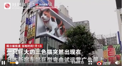 中国小康网讯 据日媒报道,当地时间7月1日,一只巨大的三色猫突然出现在日本新宿车站巨型弯曲试运营广告屏上,引发过往路人驻足围观。这只三色猫白天会不时出现在屏幕上和路人“说话”,到了晚上就安然入睡。这幅广告屏将从7月12日起正式运营。引发热议。