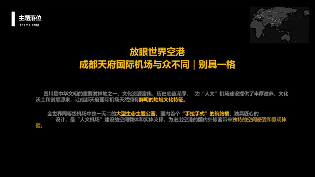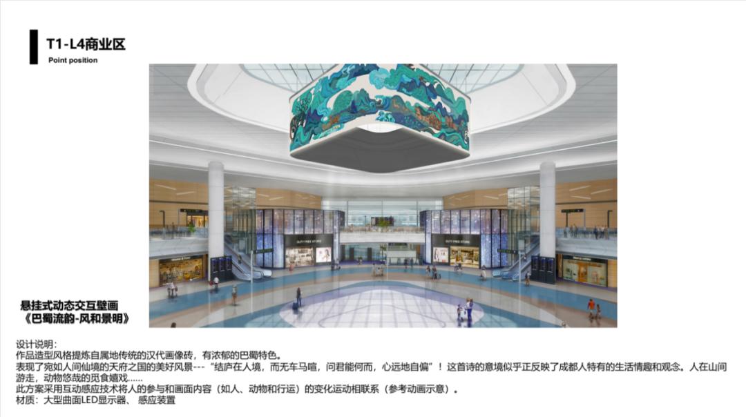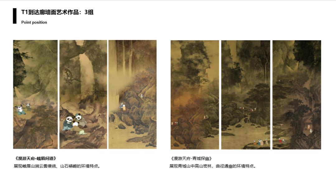 “成都天府国际机场文化艺术规划”项目整体规划包括空港大道、航站楼标志雕塑、T1/T2六条指廊、六个庭院、迎宾厅、GTC、商业核心区、到达通廊、天府巷、远机位、贵宾厅等各处的艺术品与艺术化设施建设,项目以“自然之道”“人文之道”“生活之道”“锦绣之道”为主题落位,力求打造属于四川独有的地域文化新体验,放天府之异彩,扬巴蜀之神韵。