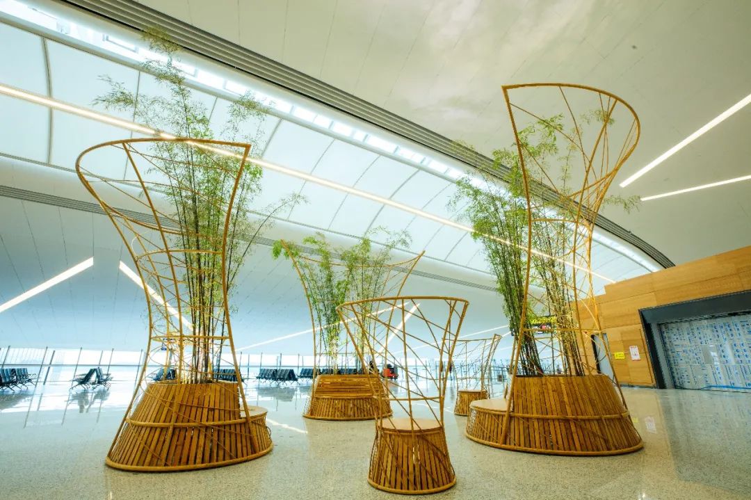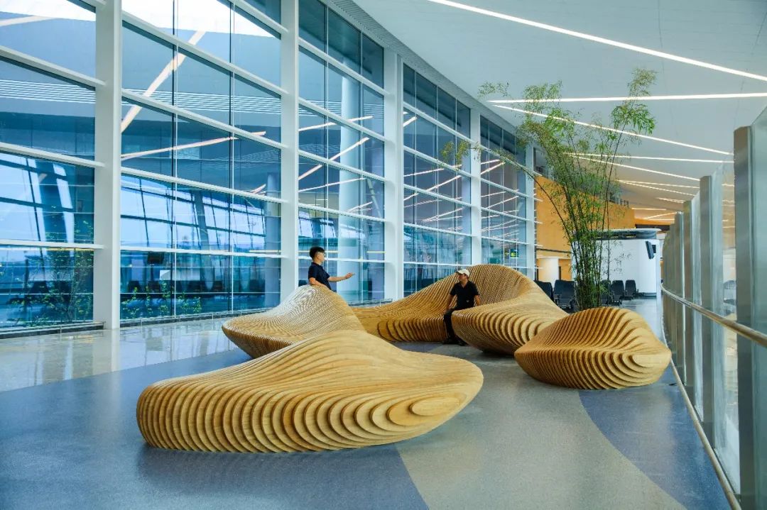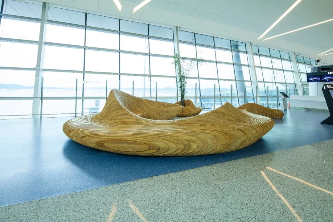 《水木相生》公共艺术设施位于T1航站楼L3层,采用“竹钢”材料工艺,从不同角度观看会产生不同的视觉效果,正所谓“横看成岭侧成峰”的意境。从室内二层向下观看整体呈字母“S”形,代表了“四川”和“水”的首个开头字母,同时座椅分为内外两侧坐人,最大化的解决了旅客临时休息的基本功能,同时“S”形分为半合围和开放空间,在小区域内解决了不同人群的聚合需求。