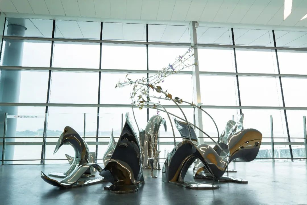 《水木相生》公共艺术设施位于T1航站楼L3层,采用不锈钢锻造工艺,作品以芙蓉花开为主题,结合蝴蝶飞舞和机场三条主跑道为元素,以抽象的艺术形态和成群的蝴蝶腾空飞起飞出窗外,来体现四川秀美山水的自然和生命力,又增加了空间的艺术感染力,作品的主题元素与自然之道的主题相呼应,能很好的和机场主题融合。