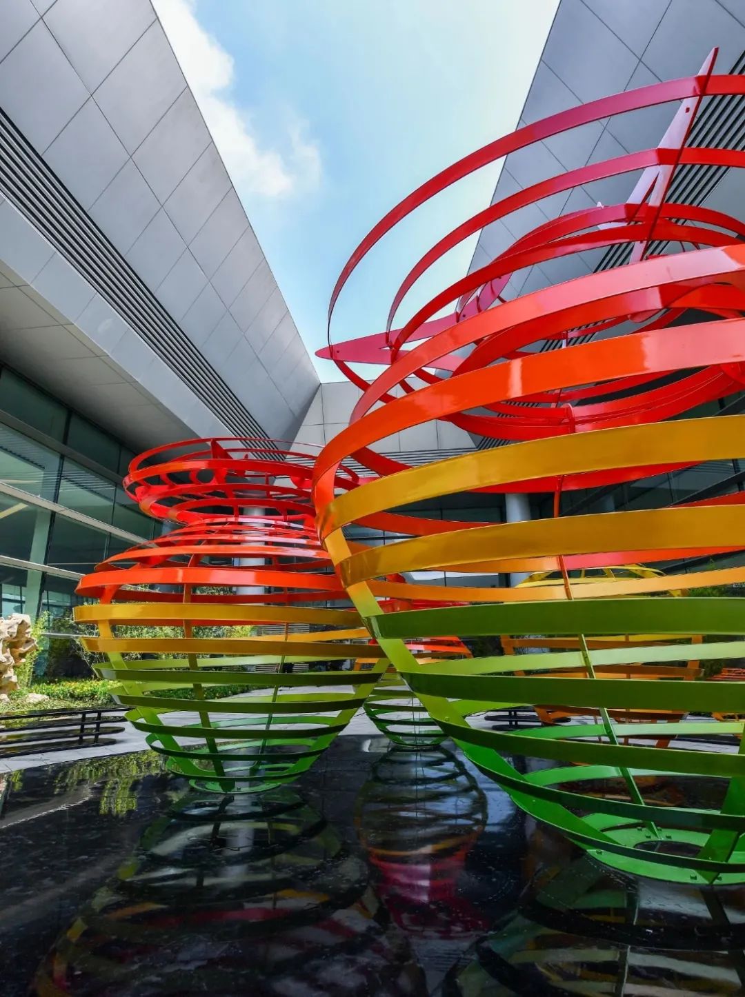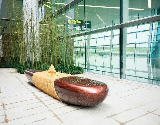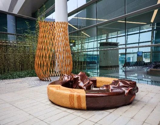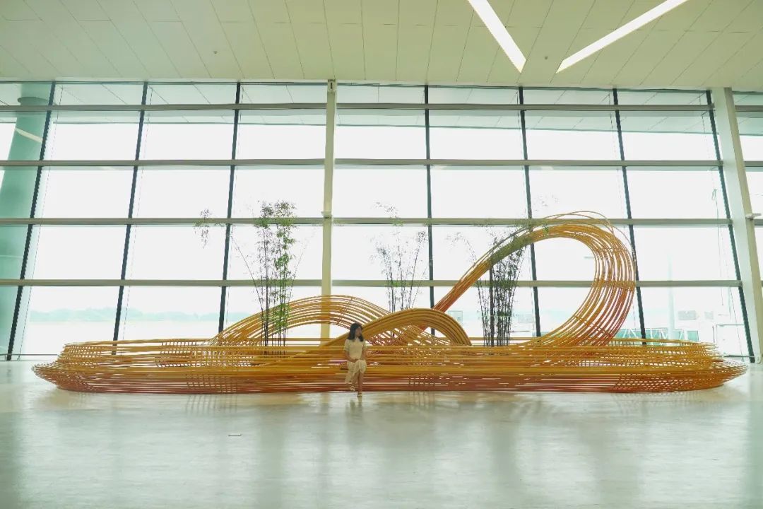 《无穷》公共艺术设施位于T2航站楼L2层,采用不锈钢锻造喷漆工艺以竹子、竹编的形式再现天府之地自然生态与人文生态之间相生相育的生命状态;造型围合呈现“∞”形态喻示了周而复始、循环往复。旅客可在环形座椅区落座休息。