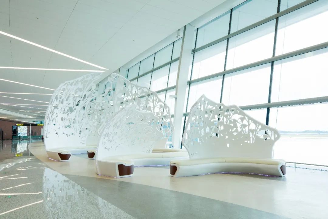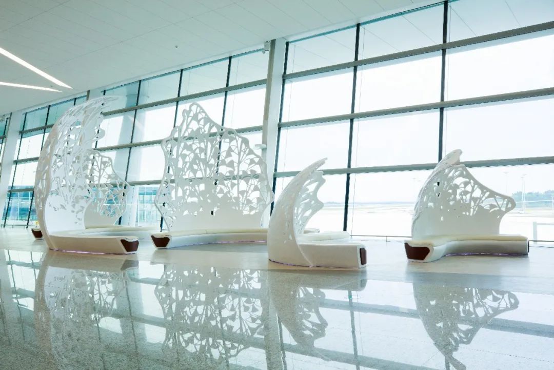 《荫》公共艺术设施位于T2航站楼L2层,采用不锈钢锻造喷漆工艺以成都市树银杏为设计元素集合现代雕塑和公共座椅的两大现代因素,融汇视觉审美和座椅两大功能提升空间人文内涵、审美价值和艺术品位满足人们精神文化需求和美好生活需要,优化了空间品质为机场的旅客提供丰富旅行体验。