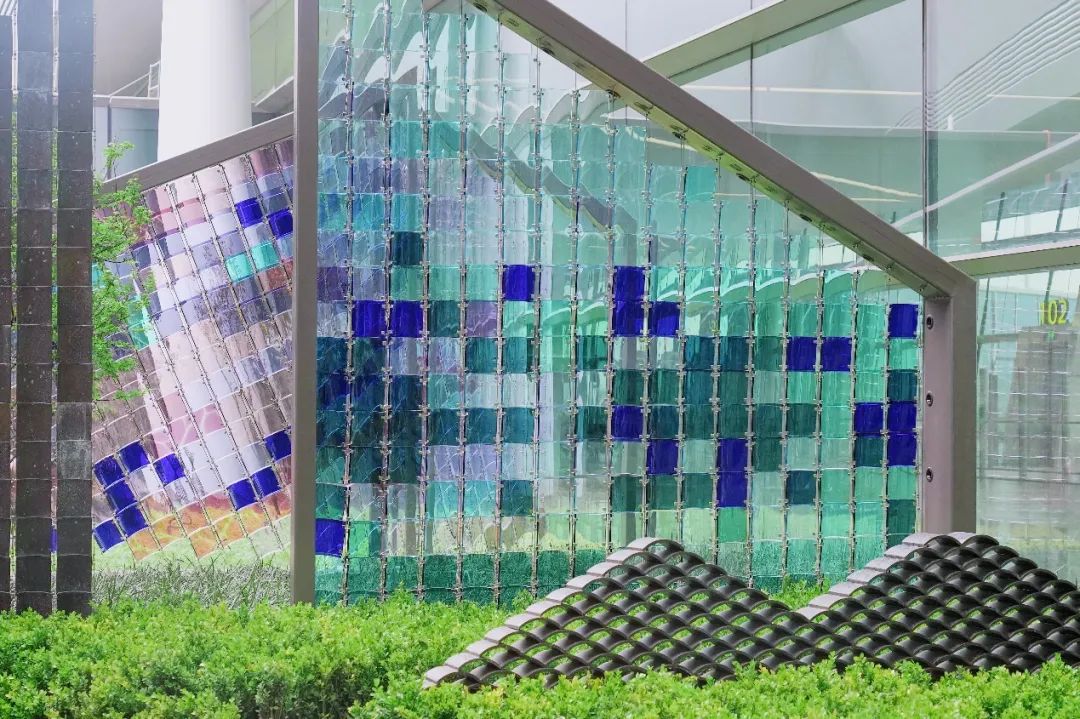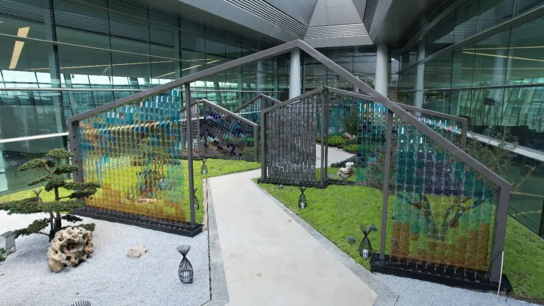 《雅舍》公共艺术庭院位于T1航站楼L3层北指廊端头,采用琉璃烧制工艺将民居小青瓦作为艺术符号,创作出“流光溢彩、锦江微波、少城春华、失焦的肌理”四组具有成都人文色彩的叙事内容。故事从城市民居的底色元素“失焦的肌理”开始讲述,经由流光溢彩的自然景致,到五光十色的生活韵律,呈现了四川民居有质感的生命律动与时尚活力的主题。