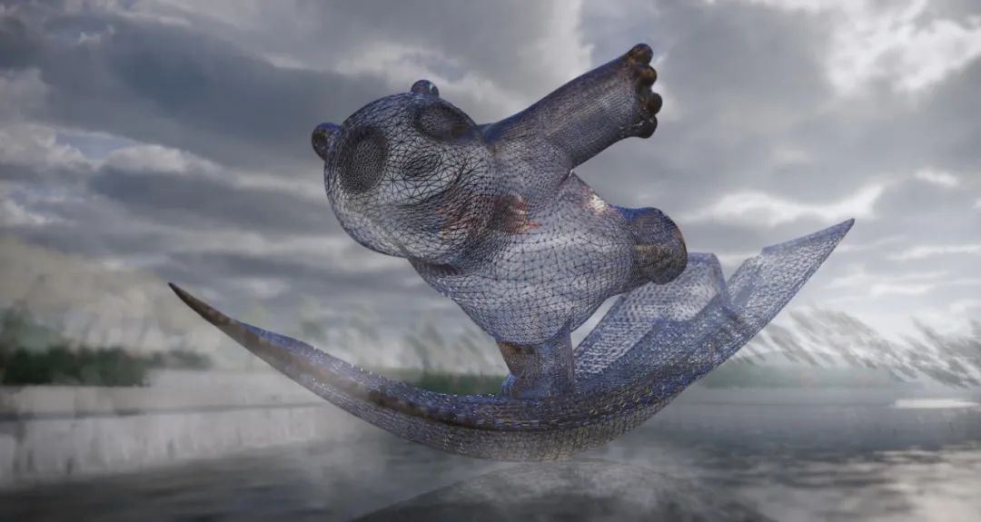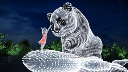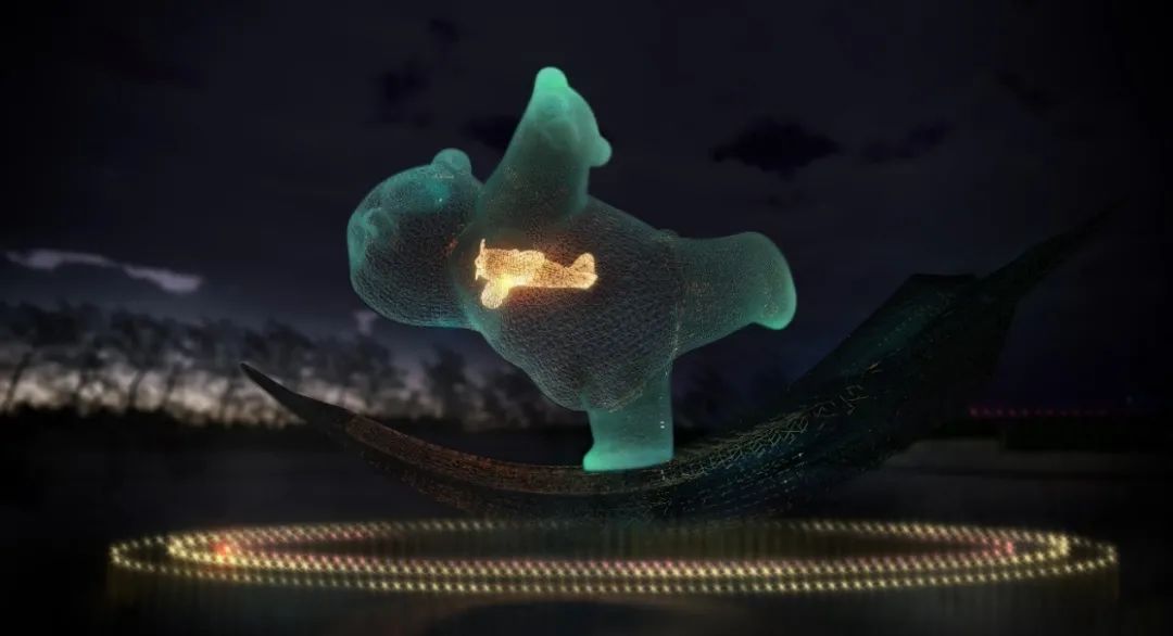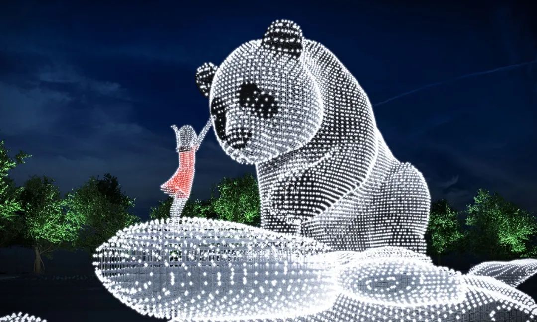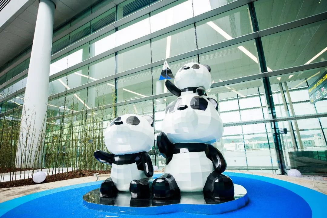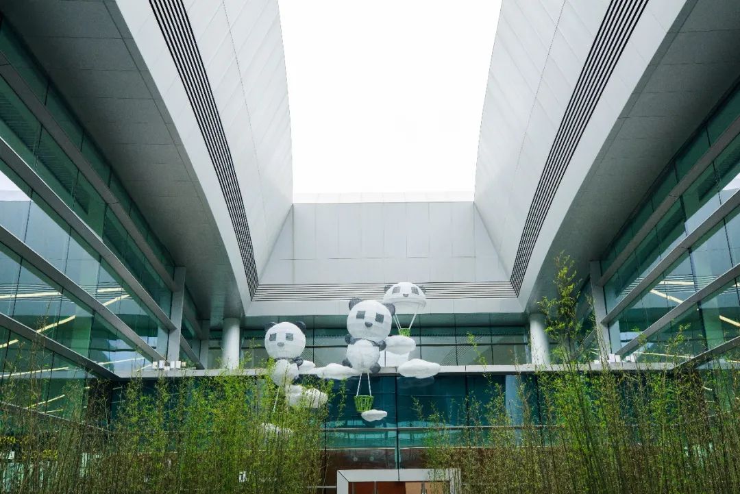 《乐园》公共艺术庭院位于T2航站楼L2层中指廊端头,采用不锈钢锻造烤漆工艺,作品以升腾蓝天白云间的熊猫热气球为主形象,表达了人类对蓝天白云的向往,代表成都的大熊猫热气球寓意成都机场蒸蒸日上和与世界共筑蓝天的美好愿景。放纸飞机寓意放飞希望和梦想,契合机场文化主题又充满童真幻想,熊猫一家亲密有爱,大熊猫托起熊猫宝宝象征托起未来,放飞希望。