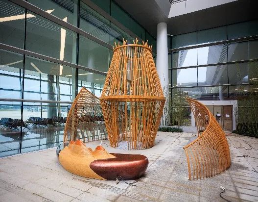 《生生不息》公共艺术设施位于T1航站楼L4层,采用“竹钢”材料工艺,以四川地区背篓造型为创意来源,通过造型的艺术化处理结合竹编工艺,将自然之竹与人文之“竹”巧妙结合,体现出四川人民代代相传的吃苦耐劳、坚忍不拔;优秀品德传承往复、生生不息。