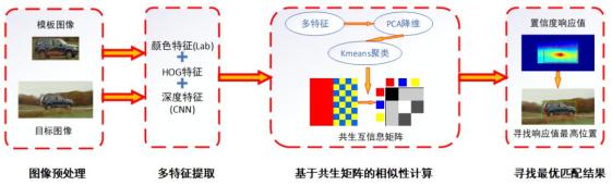 提取图像的颜色特征、HOG特征与深度特征,并通过PCA与K-means算法对图像特征进行降维分类实现特征融合,从而捕获更充足的局部特征信息,再通过对共生矩阵进行信息统计的方法得到全局信息共生得分,从而将高分数区域作为模板匹配结果。