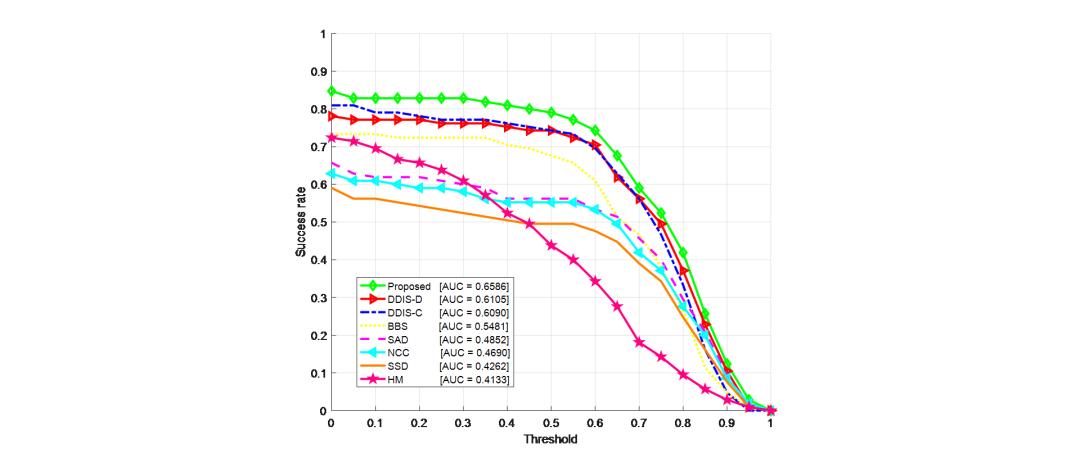 通过与目前一些匹配效果较好的模板匹配算法进行了性能对比,进行比较的算法有:DDIS、BBS、SSD、NCC、SAD以及HM(颜色直方图匹配算法)。根据实验结果绘制了成功率曲线图 (如图2)。
