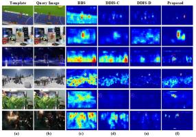 图3 不同模板匹配算法匹配结果:(a) 模板图像;(b) 目标图像中4种方法的匹配结果:BBS、DDIS-C、DDIS-D、该文算法;(c-f) 4种方法对应的置信