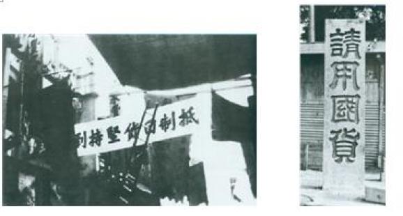 右图为当年立在福州闹市南门兜的“请用国货”石碑。