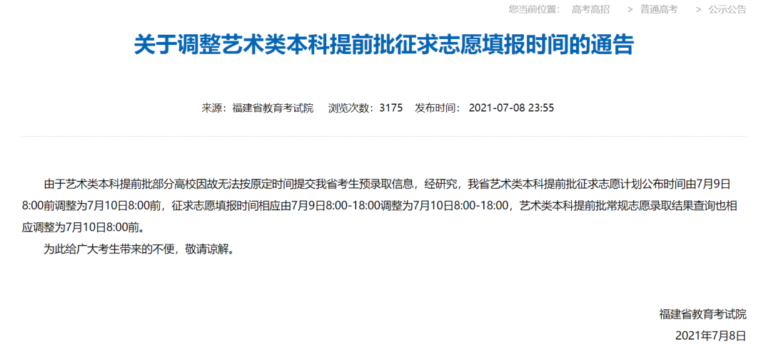 由于艺术类本科提前批部分高校因故无法按原定时间提交我省考生预录取信息,经研究,我省艺术类本科提前批征求志愿计划公布时间由7月9日8:00前调整为7月10日8:00前,征求志愿填报时间相应由7月9日8:00-18:00调整为7月10日8:00-18:00,艺术类本科提前批常规志愿录取结果查询也相应调整为7月10日8:00前。