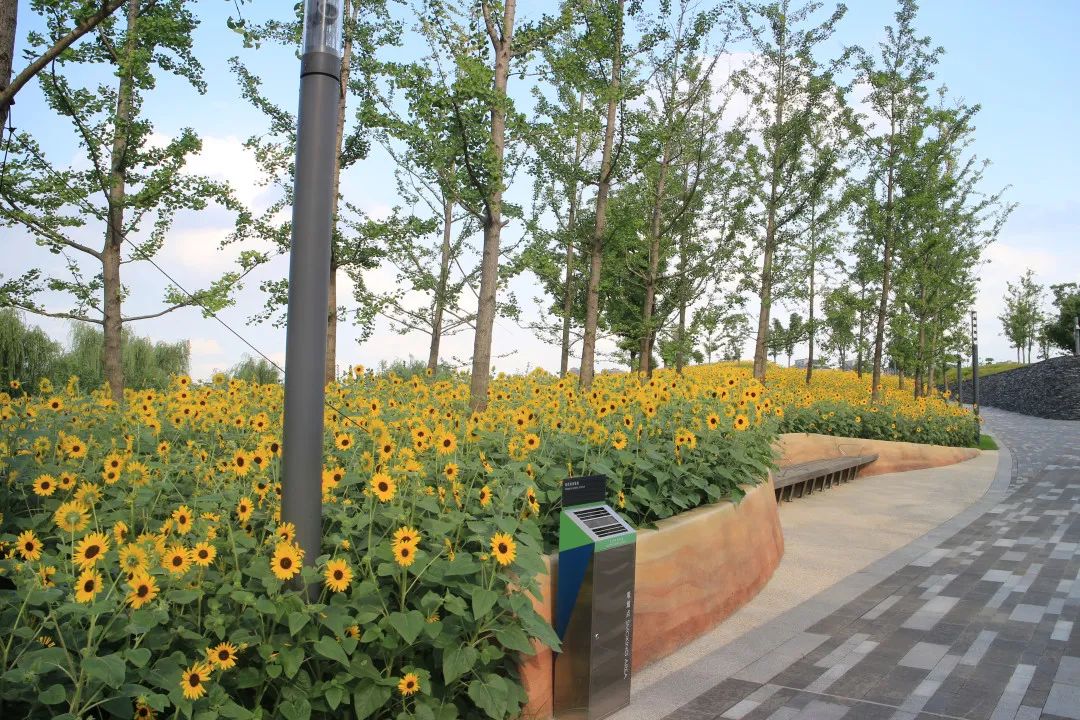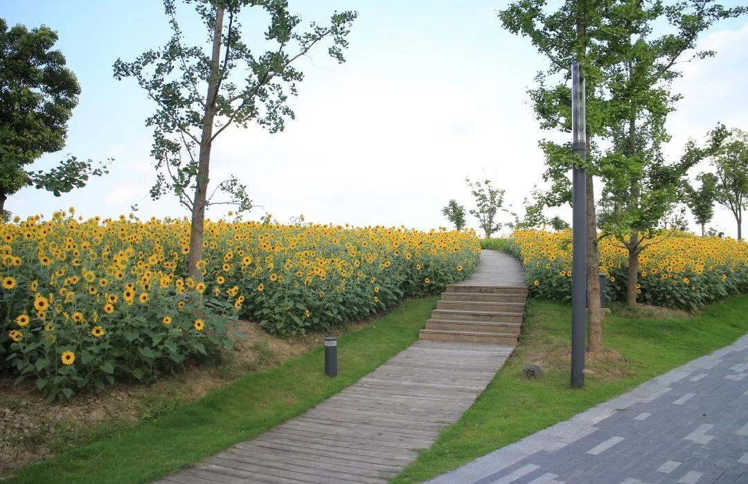 桃浦中央绿地入口处有约150平方米的向日葵,伴着热浪迎面扑来,以灿烂的姿态迎接游客,再往里走一走,木栈道附近还有约2200平方米的向日葵花海。