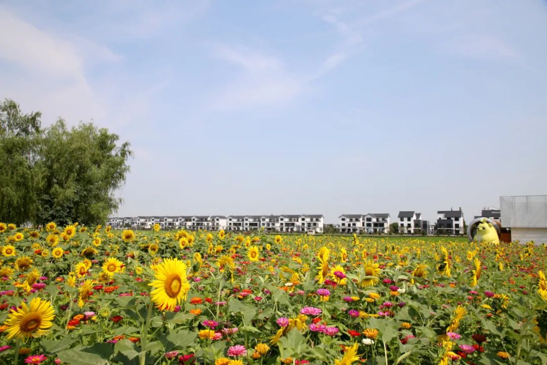 在安亭镇向阳村内,2000平方米的向日葵花海正惊艳绽放。盛夏时节,漫步在阳光下的田野,穿行在金色花海中,随处都是自然界清新的草木芳香……随手一拍便是大片。从高处俯瞰,连绵的花海在阳光照耀下金光灿灿,美不胜收~