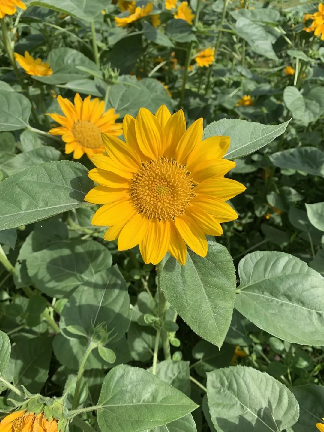 从北门进入大宁公园,映入眼帘的美景令人眼前一亮,1160㎡的中央花坛内种植了一整片的向日葵,共有一万多株。公园种植的向日葵属于观赏性向日葵,矮生品种。 矮向日葵为一年生草本,株高 50 - 70厘米,单叶互生,金黄亮的花着生在头状花序上,高度及其适合游客仔细观赏其形态及拍照合影。