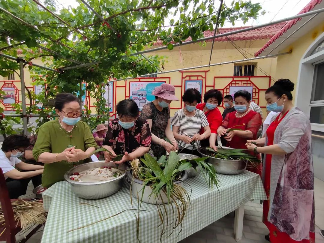 沙尼汗(右二)与十几位各族老邻居身着喜庆色彩服饰,在葡萄树下包着粽子