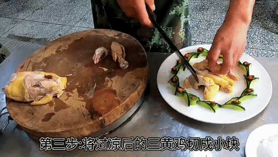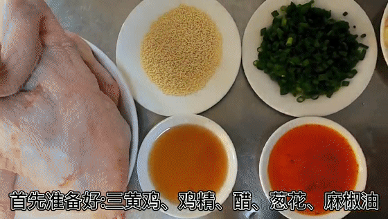 主料:三黄鸡。调料:辣椒油、黄栀子、葱、姜、盐、鸡精、白糖、香油、生抽、麻椒油、醋、料酒