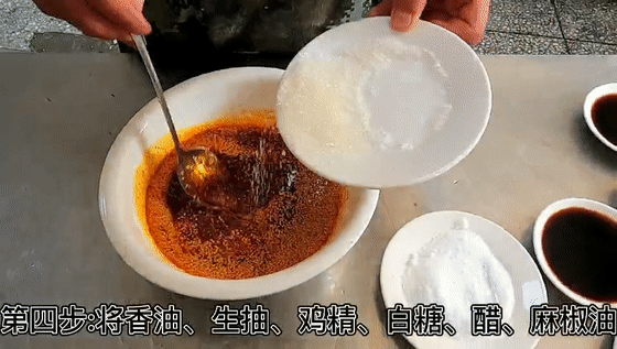 將香油、生抽、鸡精、白糖、醋、麻椒油放入辣椒油中调制