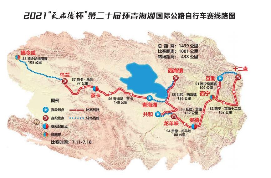 2021“天佑德杯”第二十届环青海湖国际公路自行车赛将于7月11日至7月18日在青海省境内举办,赛事全程共8个赛段,途径西宁、海东两市,海北、海南、海西三州,总距离1439公里,其中比赛距离1001公里,转场距离438公里,有来自全国17支队伍参加本次比赛。