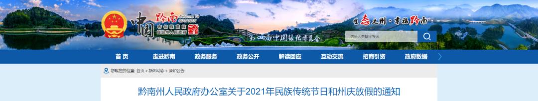 根据《黔南州人民政府办公室关于州庆纪念日和布依族苗族传统节日放假的通知》(黔南府办函〔2011〕25号)精神,经州委、州政府同意,现将2021年民族传统节日和州庆放假安排通知如下: