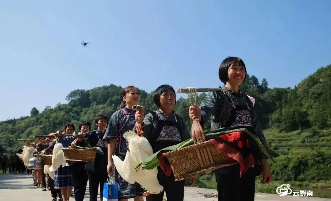 布依族外嫁女,挑着鸡、鸭、鹅、米酒回娘家看望母亲,表达感恩之情