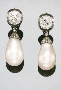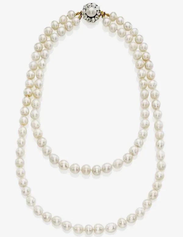 这条双股天然海水珠珍珠链同样为国王相赠,由95颗珍珠组成,20世纪末以635,000瑞士法郎的价格拍出。右侧的钻石镶嵌水滴形珍珠耳坠则是玛格丽特最喜欢的耳坠之一。