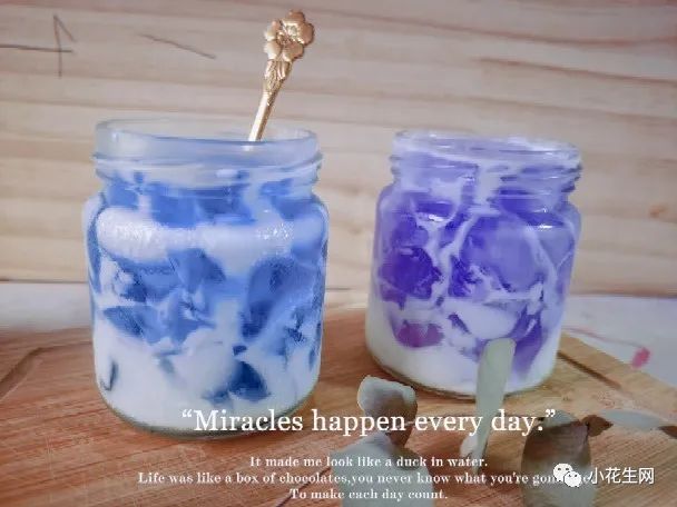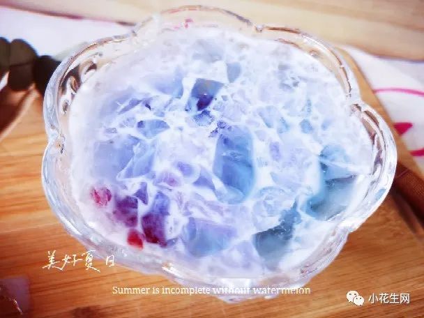 这里面的果冻可以做成各种各样颜色的,图里的星空蓝,可以通过泡几朵蝶豆花来达到。