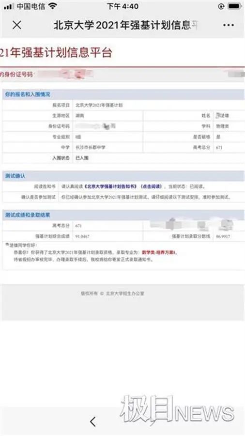 这名高考671分的孩子名为楚雄(应家属要求隐姓)。9日晚,楚雄姐姐接受极目新闻采访时称,这是她5日拍的视频。当时,一家人正在长沙的家里查询弟弟的录取结果,确认其已经被北大数学学院录取,其综合成绩也已经超过了录取线不少。